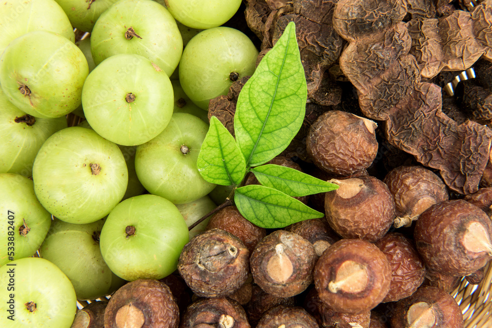 Soap pod ,soap nut tree and Indian gooseberry fruits background.