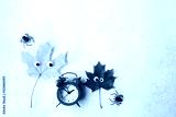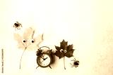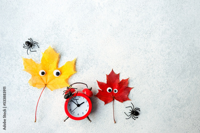 autumn maple leaves with google eyes, decorative spiders and alarm clock on grey background. symbol of autumn season. Halloween holiday. fall time concept. flat lay