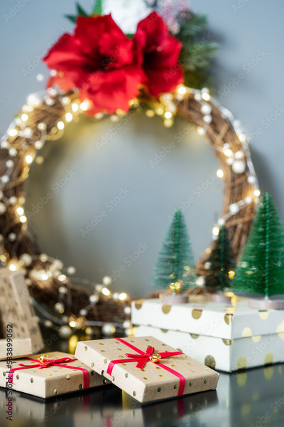 Christmas composition with gift boxes, red lantern, small Christmas trees decor and elegant flower wreath on black table on gray wall background. Festive home decor. Scandinavian style. Copy space