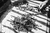 Harvest of dried medicinal herbs. Mature human hands holding herbal bunch. Senior old florist prepared condiment crop. Seasoning cultivation for aromatherapy or homeopathy. Dry mint, thyme or rosemary