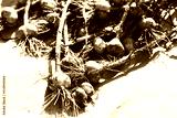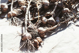 Closeup dried garlic selective focus isolated on white background. Greenhouse harvest on paper sheet. Natural herbal medicine plant and vitamin supplement concept. Top view with copy space