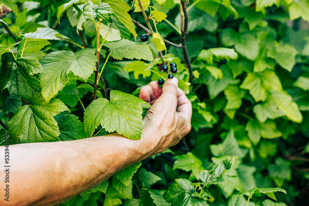 Farmer hand picking ripe black currant from bush closeup. Vitamin nutrition harvest, garden sweet berry crop gathering. Organic food stuff harvesting and gardening concept. Shot with selective focus