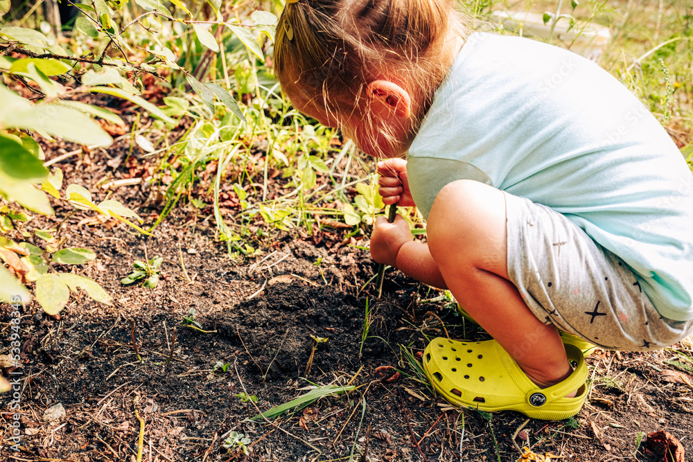 Closeup little girl child playing in garden. Preschooler planting seedlings on countryside yard. Toddler kid learn gardening, cultivating flower and plant. Kids and ecology, environment concept