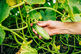 Closeup human hand picking ripe cucumber. Farmer gathering organic vegetable at eco farm plantation. Organic natural home veggie growing and cultivation. Agribusiness and independent farming
