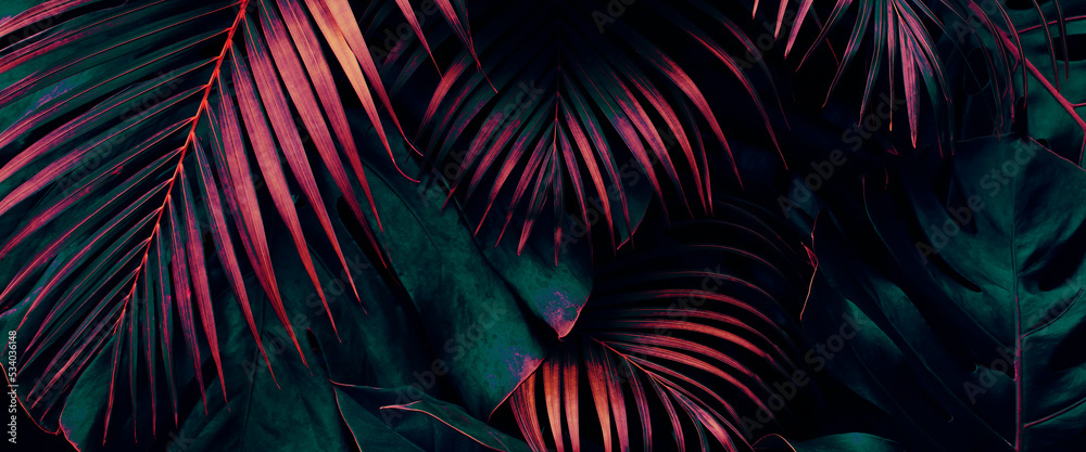Tropical leaves, dark jungle background, color toned