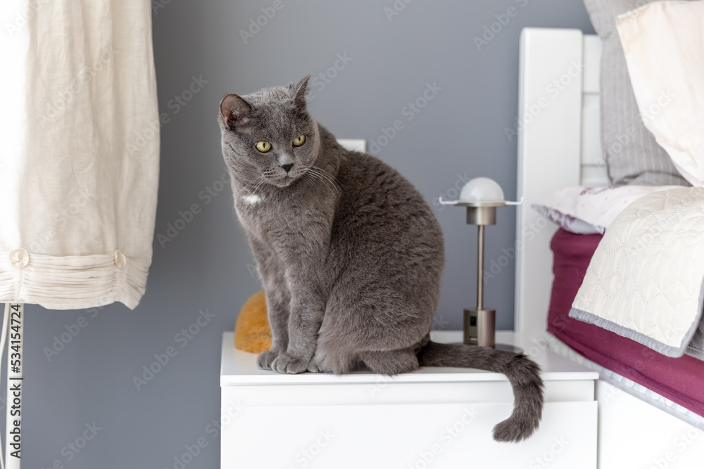 Adult big beautiful british cat sits near the bed.