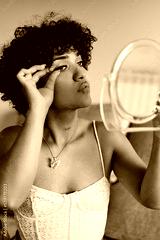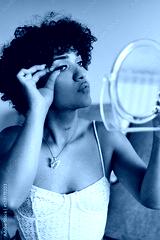 Transgender woman looking in a small mirror while putting false eyelashes on her eyes.