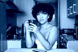 Transgender woman looking away while relaxing drinking a cup of coffee in the kitchen at home.