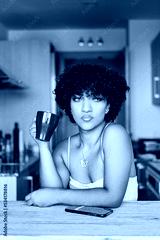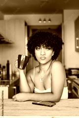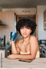 Transgender woman holding and drinking a cup of coffee sitting in the kitchen at home.