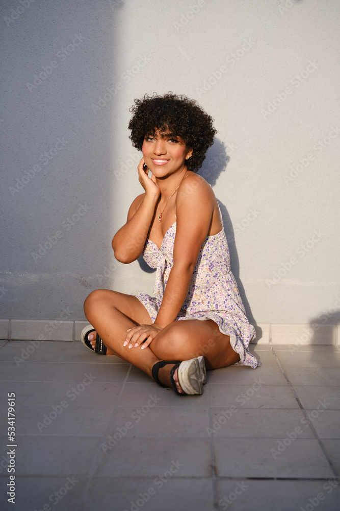 Transgender woman looking at camera and smiling while posing sitting on the terrace floor.