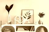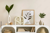 Interior design of harmonized living room with mock up poster frame, white commode, vase with leafs, decoration, books and elegant personal accessories. Cozy home decor. Template.
