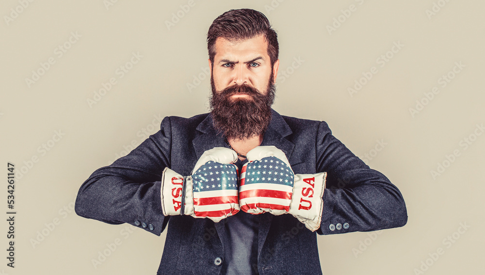 Businessman in america boxing gloves. Businessman with boxing gloves. Man in suit and american boxing gloves, business winner