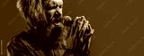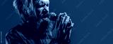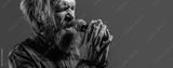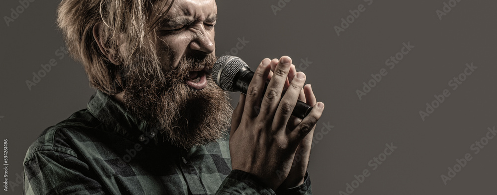 Man with a beard holding a microphone and singing. Bearded man in karaoke sings a song into a microphone