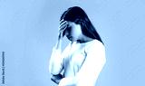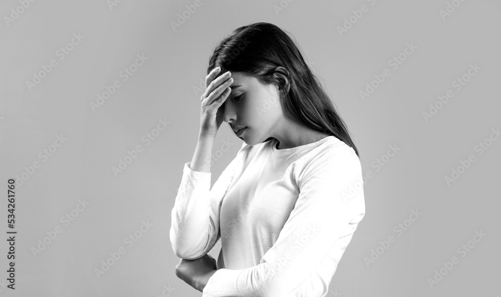 Woman with hard headache holding hands on head. Brunette woman touching her temples feeling stress, on gray background. Black and white