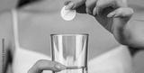 Take some pills, holds glass of water. Young woman taking pill against headache