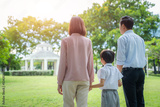 Parents take their children for a walk in the park,Happy family relationship concept,Relaxed lifestyle.