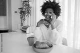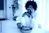 Portrait of young woman working from home speaking on phone. Happy female model sitting at table with cosmetic eye patches talking with colleague on smartphone. Portrait, remote work concept