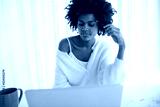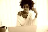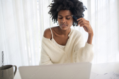 Pensive Black woman working on laptop from home. Horizontal shot of young businesswoman in casual clothes looking at laptop screen, thinking. Home office, technology, brainstorming concept