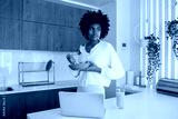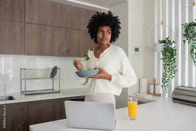 Portrait of young woman working from home holding salad. Relaxed female model having lunch during break, standing in kitchen. Portrait, remote work concept