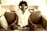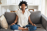 Peaceful woman sitting on sofa, meditating in headphones. African American woman with closed eyes sitting in lotus position, listening to meditation. Meditation, relaxation, mindfulness concept