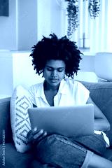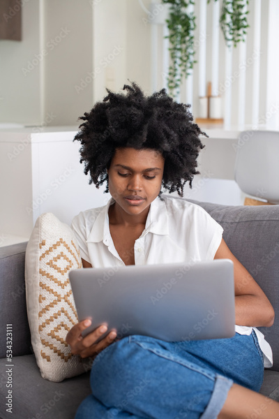 Focused woman sitting on sofa and working on laptop. African American employee working from home during self-isolation, looking at laptop screen. Home office, pandemic, technology concept