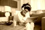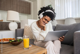 Happy African American woman having video call on laptop. Smiling blogger in headphones sitting on sofa at home, talking with friend or colleague. Communication, emotion, technology, freelance concept