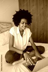 Cheerful African American woman sitting on bed and using laptop. Vertical shot of smiling female freelancer working from home, typing on laptop. Home office, technology concept