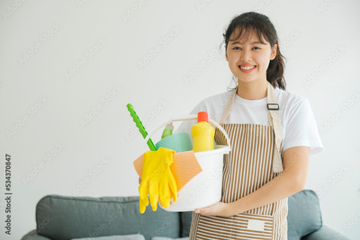 Young woman holding cleaning equipments ready for cleaning.