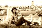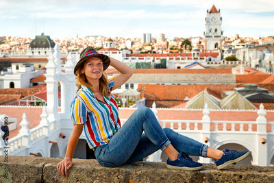 Girl tourist in a hat on the background of the city of Sucre, Bolivia.