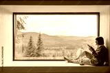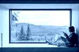 Woman sits with phone on window sill and enjoys scenic view on mountains while resting in wooden house on nature. Recreation and escaping to nature