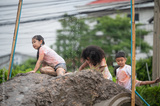 International Children playing water slides, Asian children, African American children