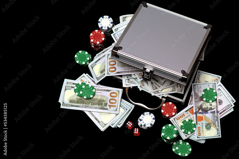 Gambling Briefcase Full of Money Cash, jackpot, casino chips. Suitcase with dollars, poker chips. Metal cash box Container stuffed with Paper currency, Casino tokens, gaming chips, checks, or cheques