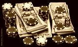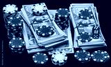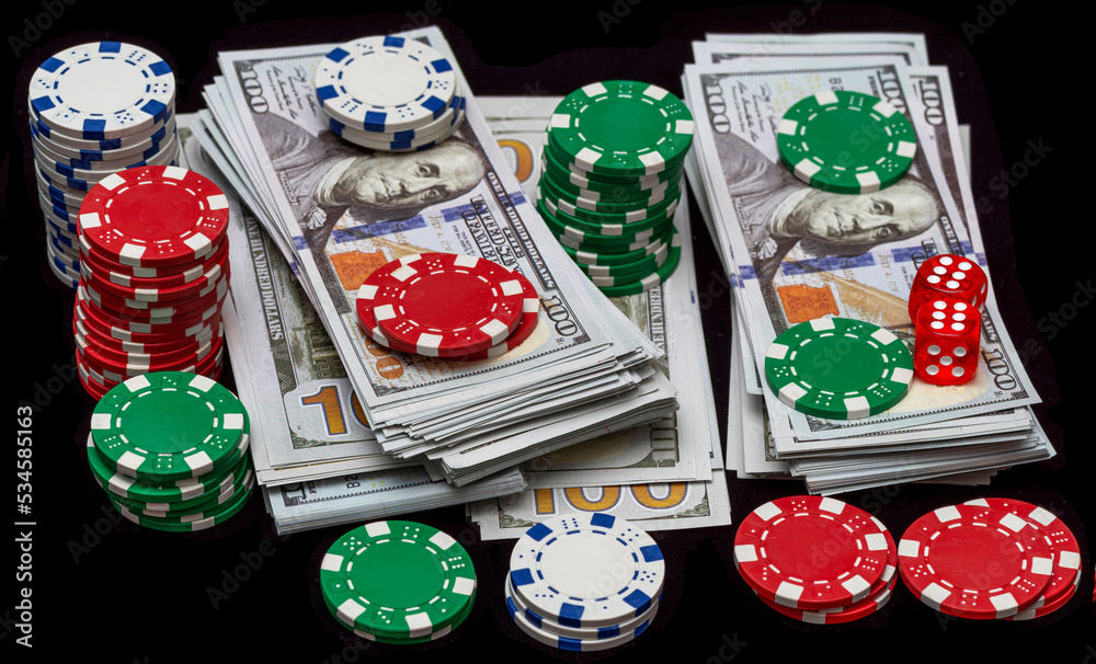 Poker cards royal flush, cash money dollar bills. Gambling, casino chips, dices. Casino tokens, gaming chips, checks, or cheques on green table in casino club