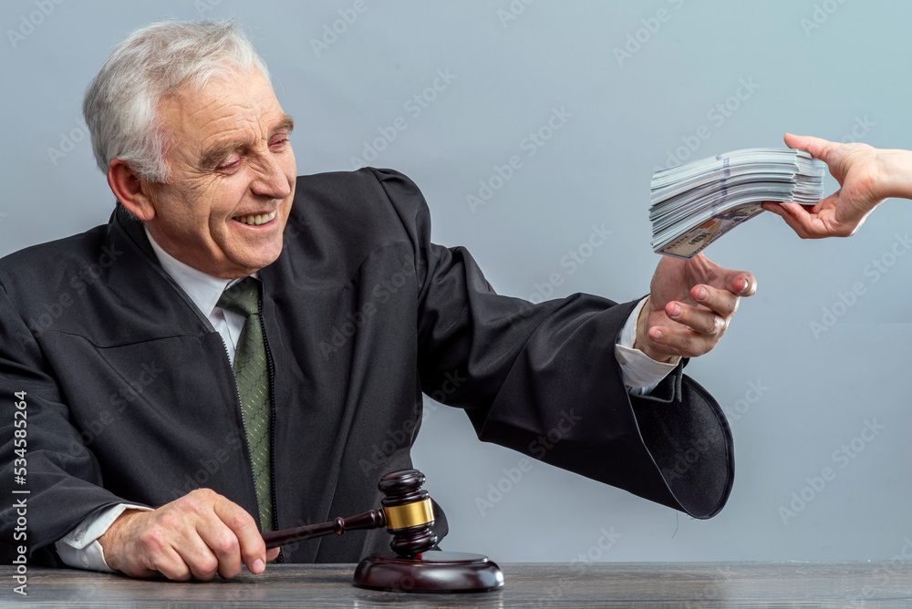 Judge and money concept. Judge's gavel on the table. Law Lord wearing gown using a hammer for verdict, justice judgment at courts of law. Dollars, bill, corruption, cost, finances, expenses, salary