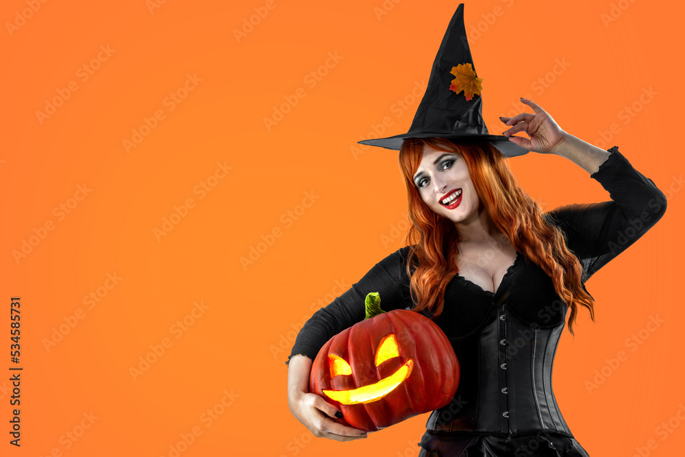 Witch on Halloween. Female wizard fairy character for All Saints' Day. Fantasy gothic red-haired Vampire girl in black dress. Enchantress dressed in carnival costume