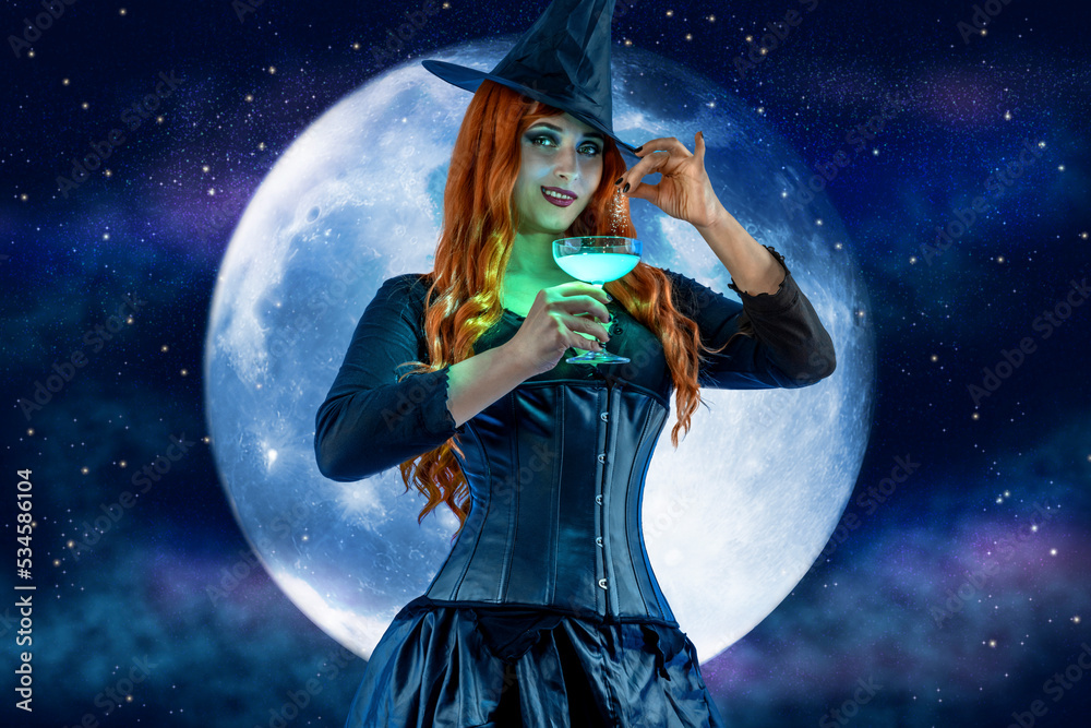 Halloween Witch making witchcraft, preparing a magic potion cocktail, spells. Female wizard fairy character. All Saints' Day. Fantasy gothic red-haired girl in carnival black dress