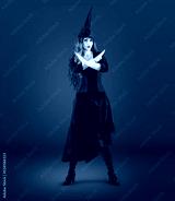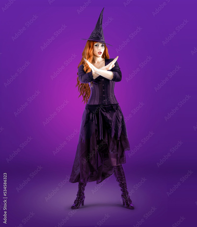 Witch on Halloween gesturing NO, disagreement, refusal. Female wizard fairy character Fantasy gothic red-haired Vampire girl in black dress.