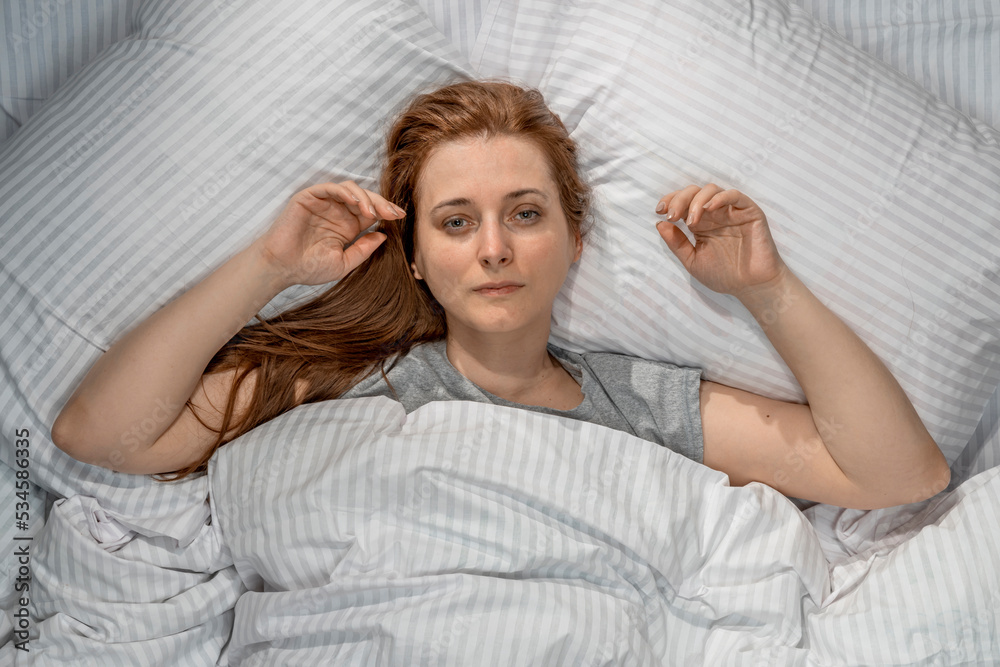 Woman sad in bed at home in the morning. Lady with long hair in pajamas. Girl on clean white bedding with cozy blanket in the bedroom. Disappointment and unhappiness