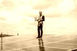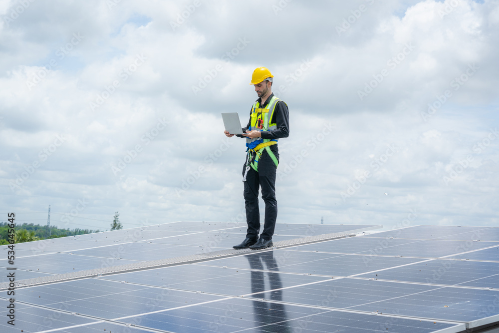 Engineer or worker installing a solar cell on the roof in warehouse factory,Eco technology for electric power.