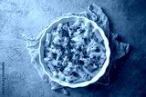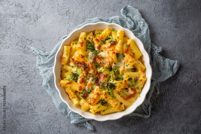 Pasta baked with broccoli and chicken. Broccoli, cheese and gratin sauce on baked penne pasta.