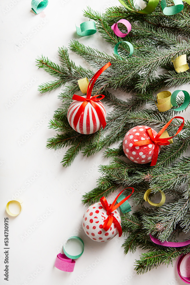 Christmas tree green branches and decorations on light surface holiday concept top view