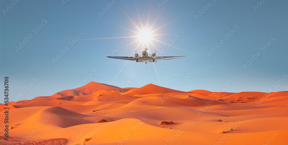 Beautiful sand dunes in the Sahara desert - Sahara, Morocco - Vintage type old metallic propeller airplane in the sky