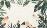 Beauty and fashion concept with spa set on pastel rustic wooden background.