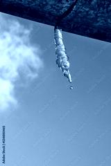 Icicle against blue sky and white cloud. Drop of melted snow drips. Closeup. Icicle hangs from rain gutter on roof. Vertical illustration about beginning of spring. Winter thaw. Macro