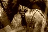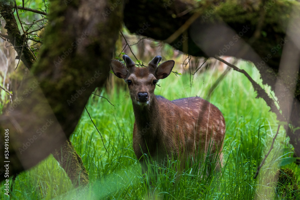 free roaming Sika buck (Cervus nippon) standing on a sunny patch in a dark forest at Lough Leane near Ross Castle Killarney