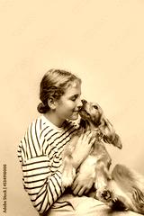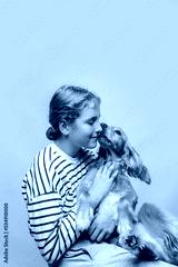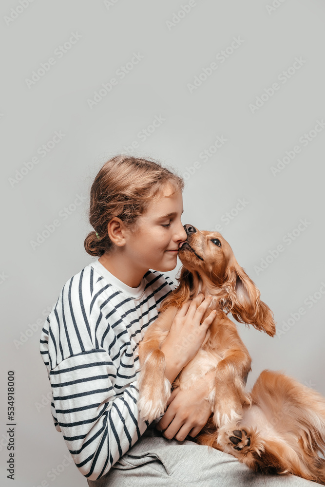 Girl playing with dog cocker spaniel. Kid pet friendship. The concept of love for pets