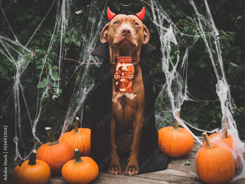Charming, sweet brown dog and Count Dracula costume. Closeup, indoors. Studio shot. Congratulations for family, relatives, loved ones, friends and colleagues. Pet care concept