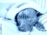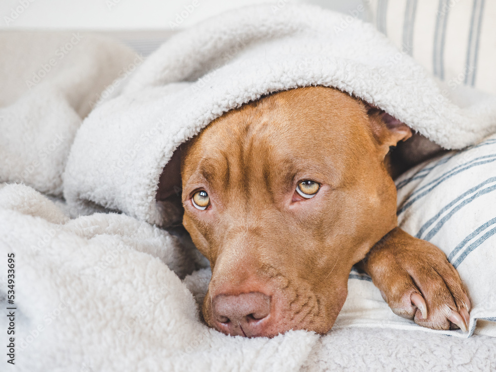 Lovable, pretty puppy lying on the bed. Close-up, indoors, studio photo. Day light. Concept of care, education, obedience training and raising pets