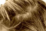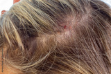 Psoriasis of the scalp , psoriatic redness, peeling and crusts on the scalp of an unrecognizable woman. An autoimmune, incurable dermatological skin disease.
