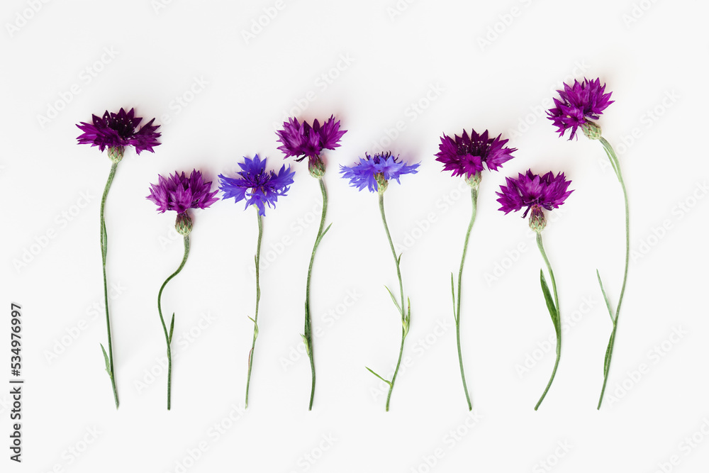 Flat lay with natural flowers of cornflower on white background. Spring, summer holiday card, postcard, invitation. Minimal floral composition. Top view nature aesthetic fon with blooms